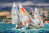 An oil painting on canvas. Regatta on the background of the city of Sochi on a cloudy day. Author: Nikolay Sivenkov.