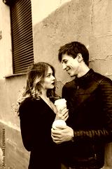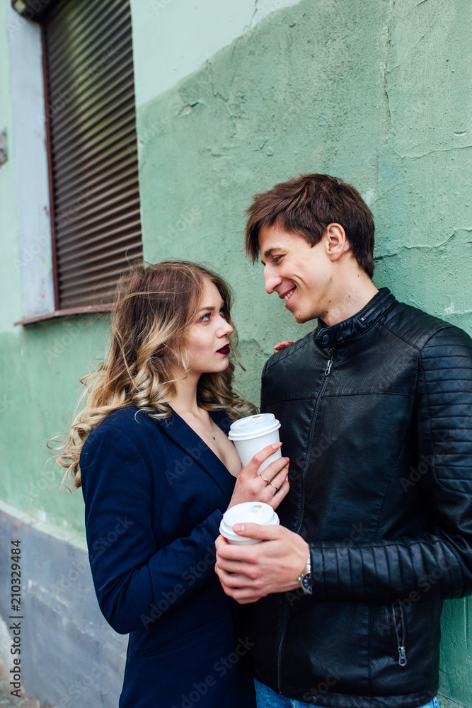 Portrait of a happy romantic couple with coffee walking outdoors in european city