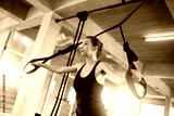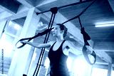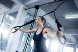 attractive sport woman workout with sling stretch body in gym health and body concept