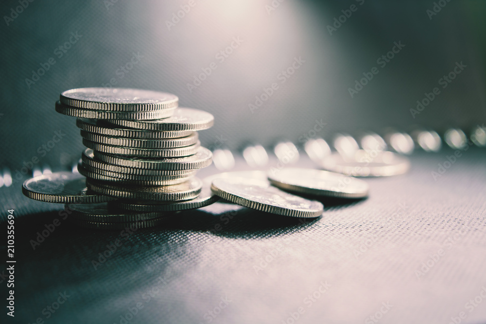 a stack of silver coins, with a few coins scattered around it on a dark surface.