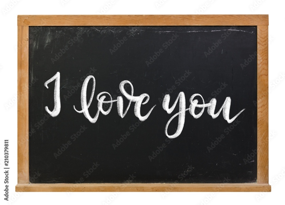 I love you hand written in white chalk calligraphy lettering on a black chalkboard isolated on white