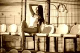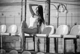 Sportive young woman with sexy body is wearing white fashion swimsuit is sitting on yellow chairs in volleyball field, summer vacations
