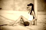 Brunette woman with sexy body is wearing white fashion swimsuit and black hat is sitting on sand in volleyball field, summer vacations