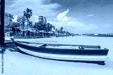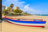 Fishing boat and palm trees on sandy beach in Estepona town on Costa del Sol, Spain