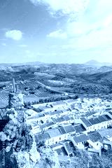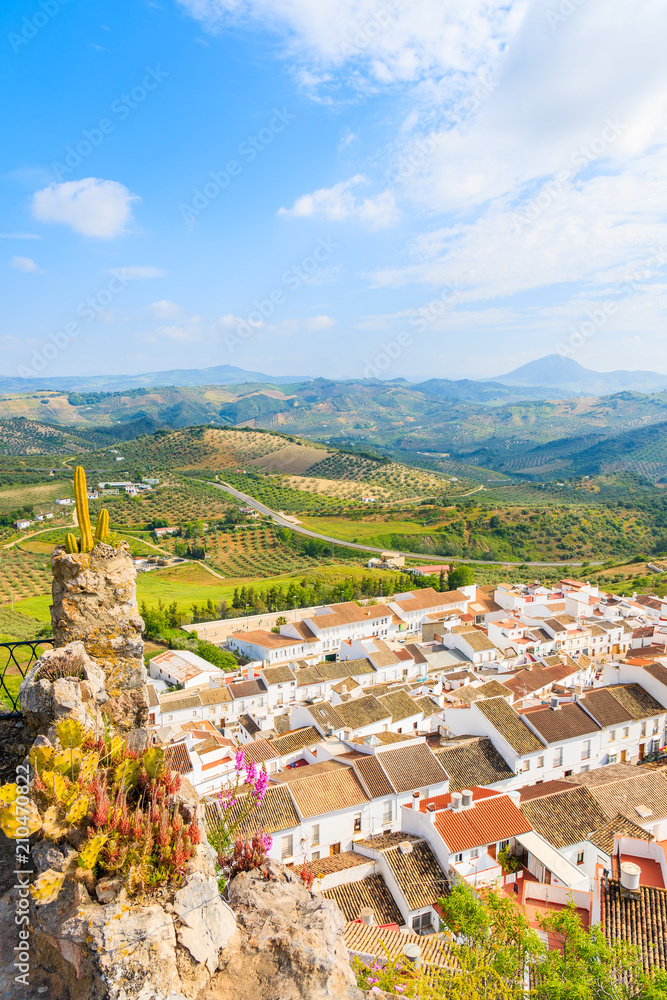 Olvera village with white houses and green fields with mountains in background, Andalusia, Spain