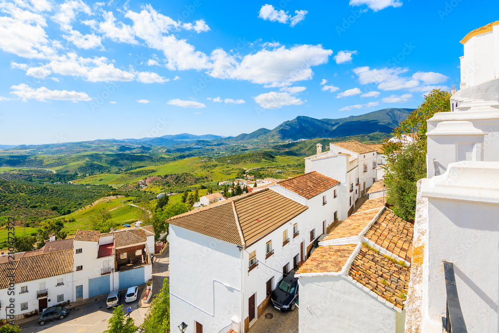 White houses in Zahara de la Sierra village in spring season on sunny beautiful day, Andalusia, Spain