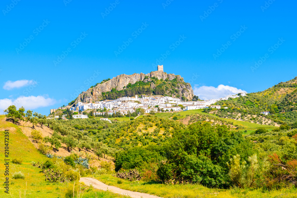 White village of Zahara de la Sierra on green hills at spring time, Andalusia, Spain