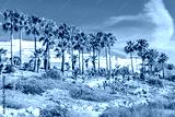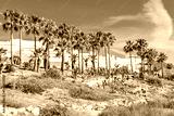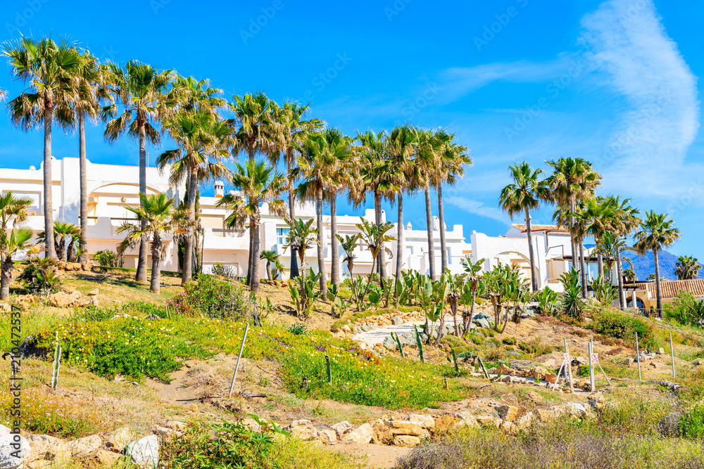 Apartments with palm trees on coastal path near Estepona town on Costa del Sol, Spain
