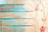 Beach background - top view of beach sand with shells, starfish on wood plank in blue sea paint color background. summer vacation concept. vintage color tone.