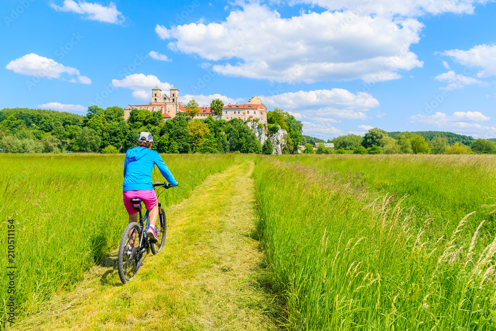 Young woman cyclist riding bike on green meadow and view of Tyniec monastery on sunny spring day, Cracow city, Poland