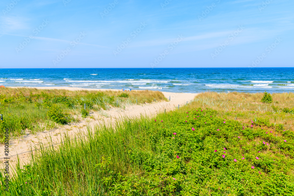 Path to beach in Baabe summer resort among sand dunes, Ruegen island, Baltic Sea, Germany