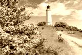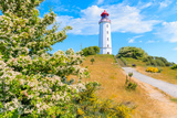 Path to Dornbush lighthouse in spring landscape with flowers on northern coast of Hiddensee island, Baltic Sea, Germany