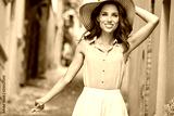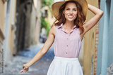 Young beautiful woman walking the streets of an Italian town