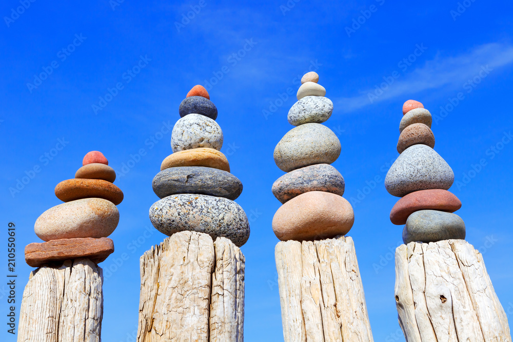 many of the Rock zen pyramid of white and pink pebbles on a background of blue sky