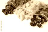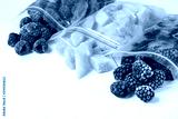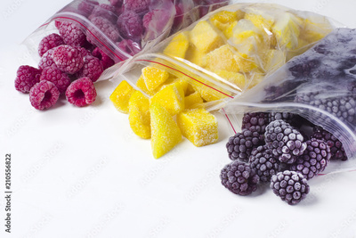 Frozen berries in reusable plastic bags: raspberry, mango and blackberry. White background