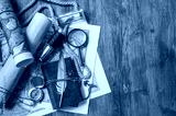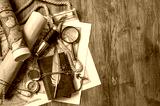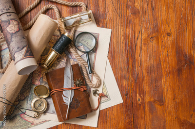 Planning a trip: quill pen, old papers and maps with vintage items