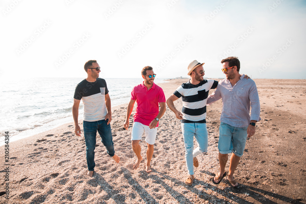 Group of happy young people walking at the beach on beautiful summer sunset. Friends and holiday concept