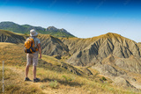 Man hiker with backpack standing against badland