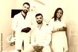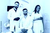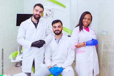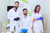 Friendly young multi ethnic personnel group graduated dentist and assistant Caucasian blond and African-American are smiling at dental office