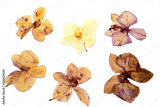 collection of dried pressed orchid flowers isolated on white background, scrapbooking, herbarium