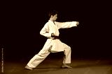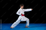 Young boy dressed in a white karate kimono with red belt.