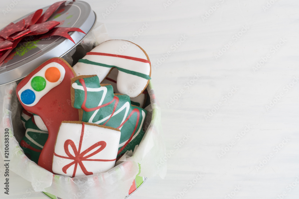 Christmas Gingerbread Cookies in a Tin on Light Background, Copy Space Right from Above