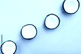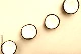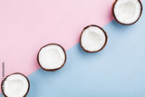 Coconut tropical fruit half on minimal pastel background top view. Creative summer pattern for modern design. Flat lay.