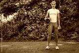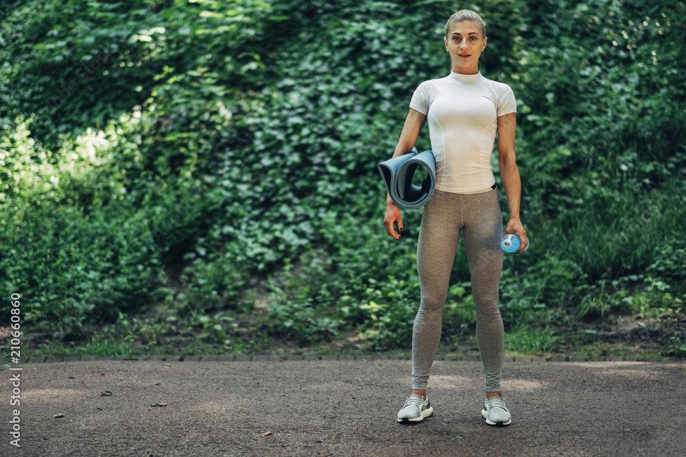 Fitness Woman Preparing for Yoga in the Early Morning Park. Wearing Stylish Sport Outfit. Blue Bottle of Water and Yoga Mat. Healthy Lifestyle.