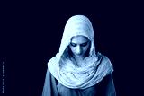 portrait of pretty girl wearing a pink headscarf. black studio background.