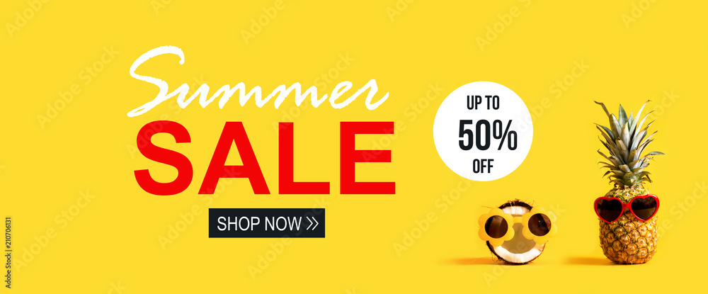 Summer Sale with pineapple and coconut wearing sunglasses