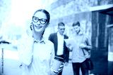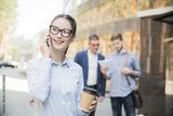 Portrait of confident businesswoman in city talking on phone, beautiful female manager having mobile conversation while strolling with coffee to go