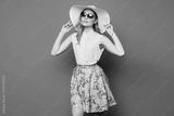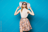 Fashionable and beautiful blonde model girl in stylish pink skirt, blouse and sunglasses adjusting her hat and posing at blue background