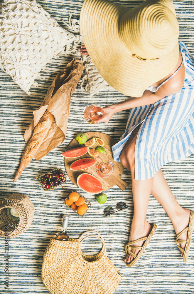 Summer picnic setting. Woman in linen striped dress and straw sunhat with glass of rose wine in hand, fresh fruit and baguette on blanket, top view. Outdoor gathering or lunch