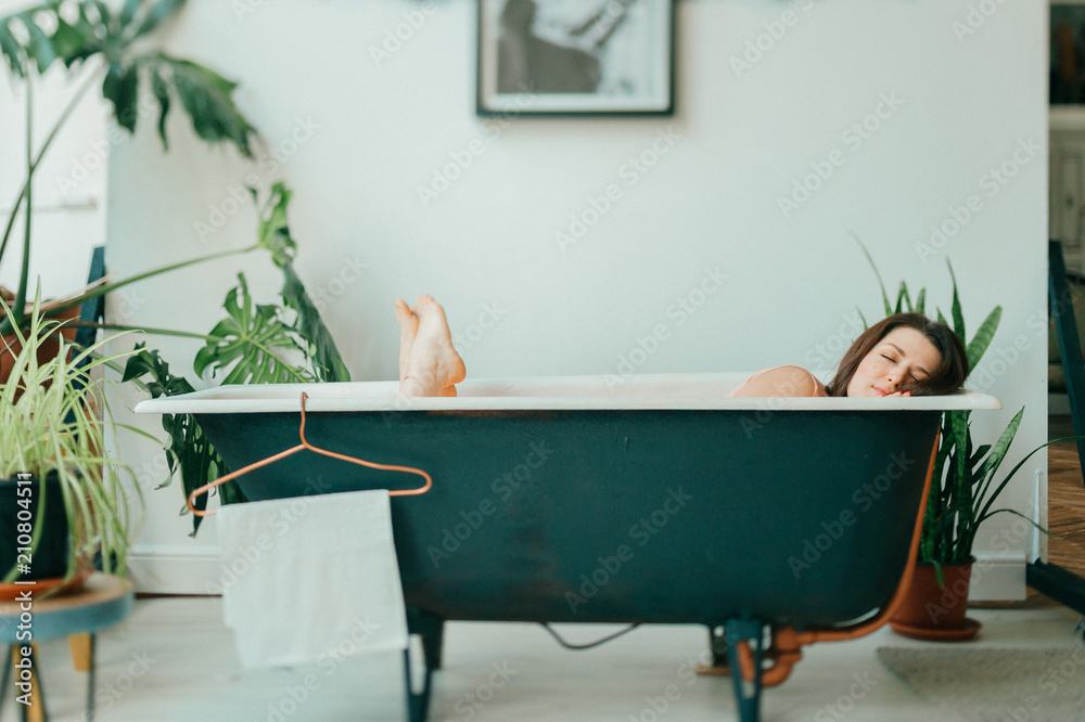 Tilt shift portrait of young beautiful girl in pink dress lying in empty vintage cast-iron bath inside decorative in french style room with green plants. Odd unusual strange woman home relaxation.