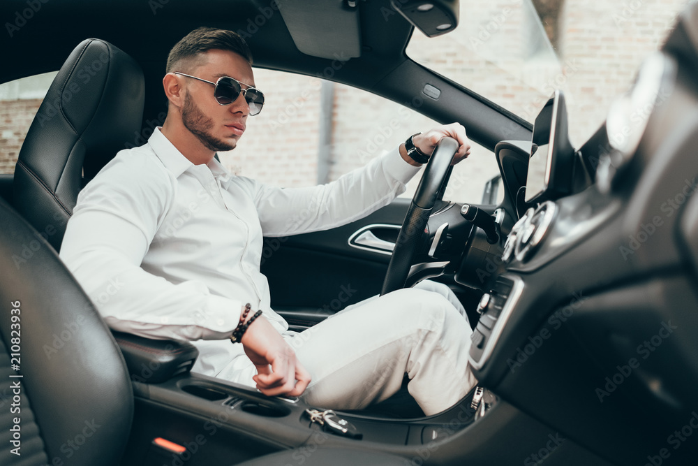 Handsome Young Man Sitting in the Luxury Vehicle