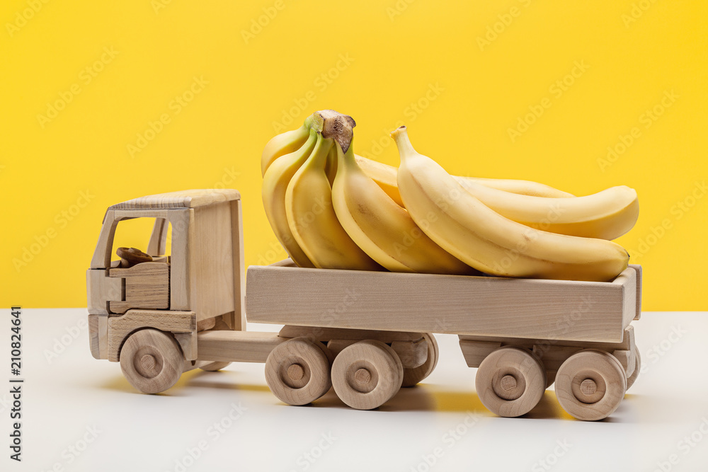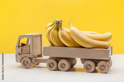 Truck ( lorry), wooden toy, ripe bananas in back.