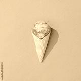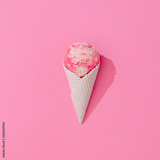 Vanilla and strawberry ice cream in white ice cream cone on pastel pink background. Summer minimalism. Flat lay.