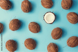 Coconut fruit colorful pattern on a pastel blue background. Summer concept. Flat lay.