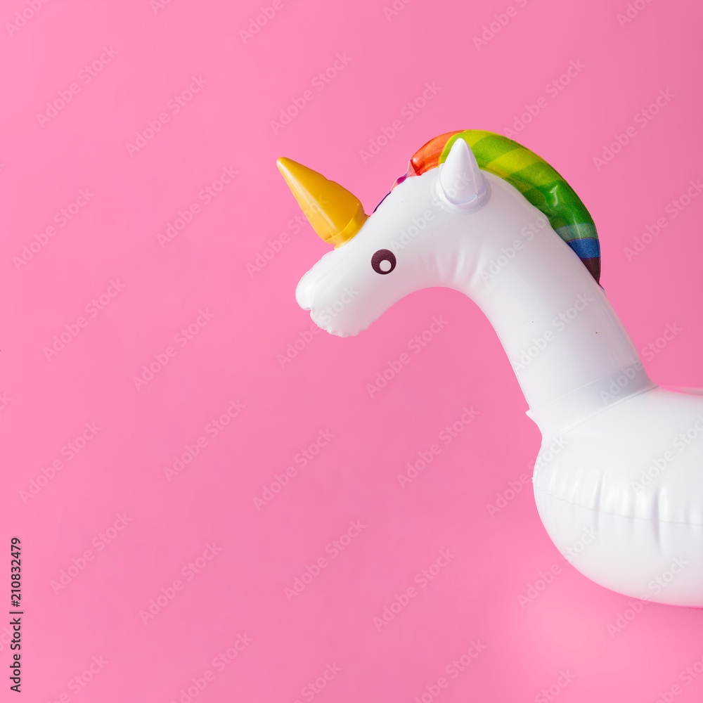 Inflatable unicorn pool toy on pastel pink background. Minimal summer concept.