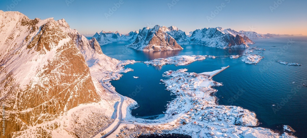 Lofoten winter scenery panorama at sunrise, village of Reine, Norway