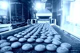 Cakes on automatic conveyor belt or line, process of baking in confectionery culinary factory or plant. Food industry, cookie and other sweet breadstuff production