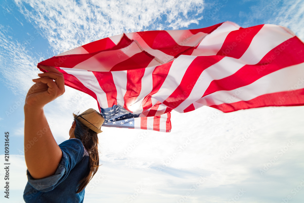 Close up young happy woman holding United States of America flag and running, jumping carefree with open arms with blue sky. USA Independence day, 4 July.