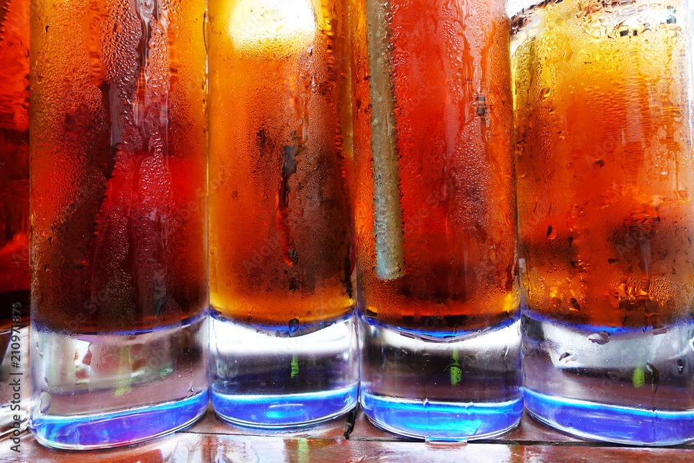 Close up of cold cocktails with cola and whiskey or vodka, alcoholic drinks for summer parties