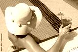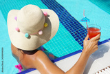 Young woman with hat and colorful swimsuit drinking cocktail at swimming pool