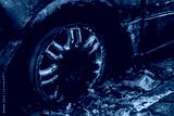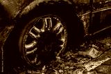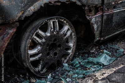 Burnt car on road. Burnt tire and molten glass