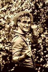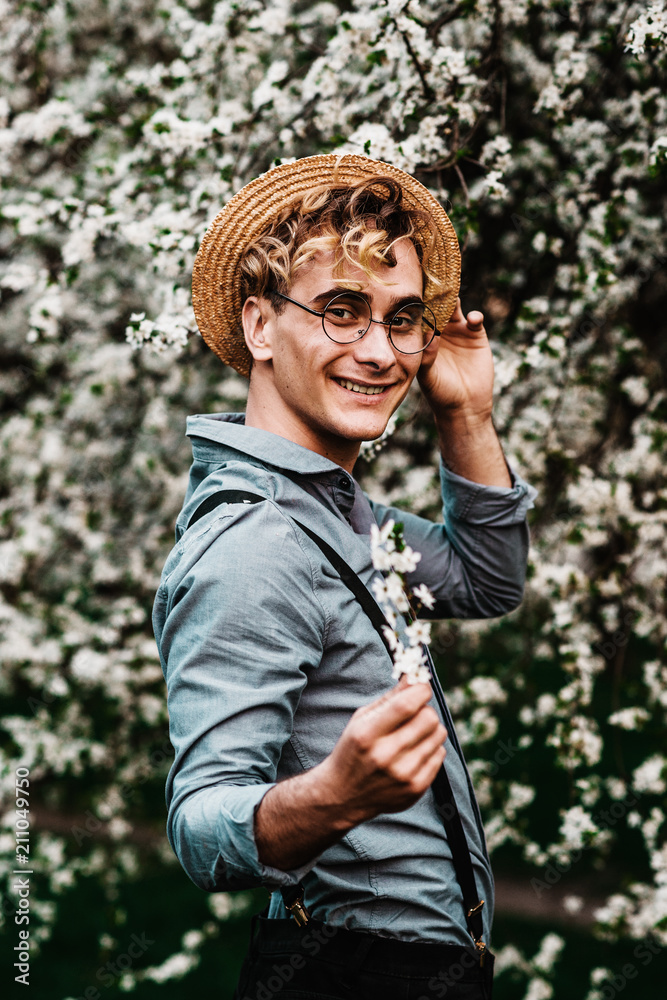 Outdoor close up portrait of young handsome happy smiling man wearing glasses and straw hat holding blossom cherry branch, posing in the blooming garden