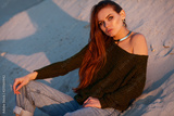 Outdoor portrait of young beautiful woman with long hair, smoky eyes makeup wearing olive green sweater, jeans, golden earrings, necklace posing in the sand. Female fashion concept