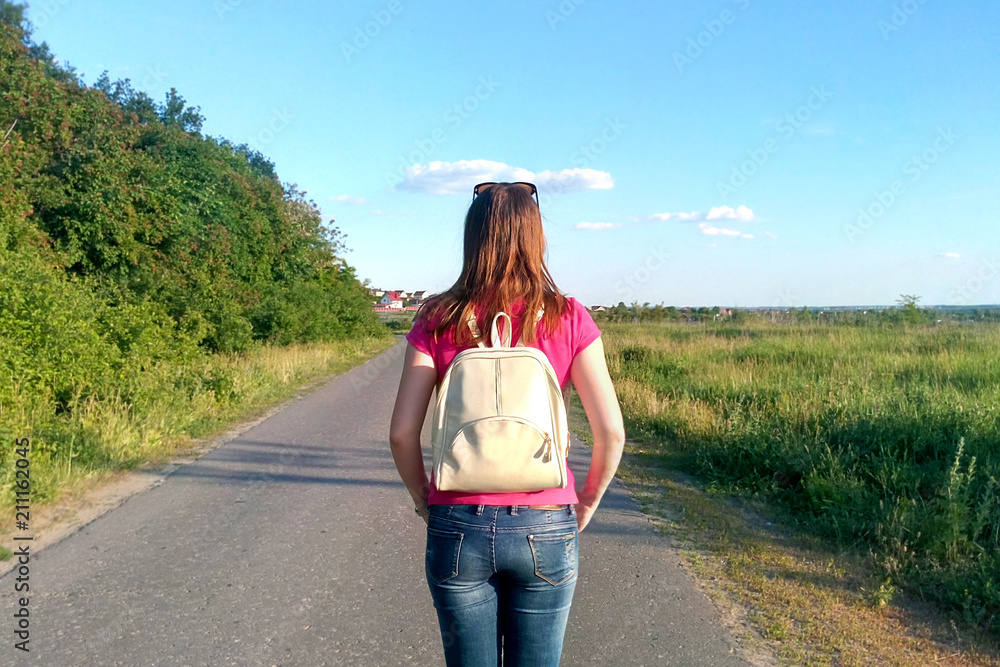 Girl with a backpack on the road near the forest journey Sunny summer day, lifestyle in the fresh air