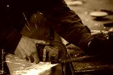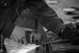 Close-up of a blacksmith's hands manipulating a metal piece above his forge, selective focus.