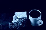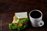 Breakfast table with sandwich and black coffee on rustic wooden background, close-up, selective focus